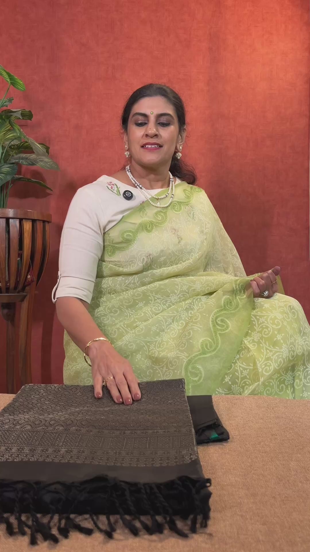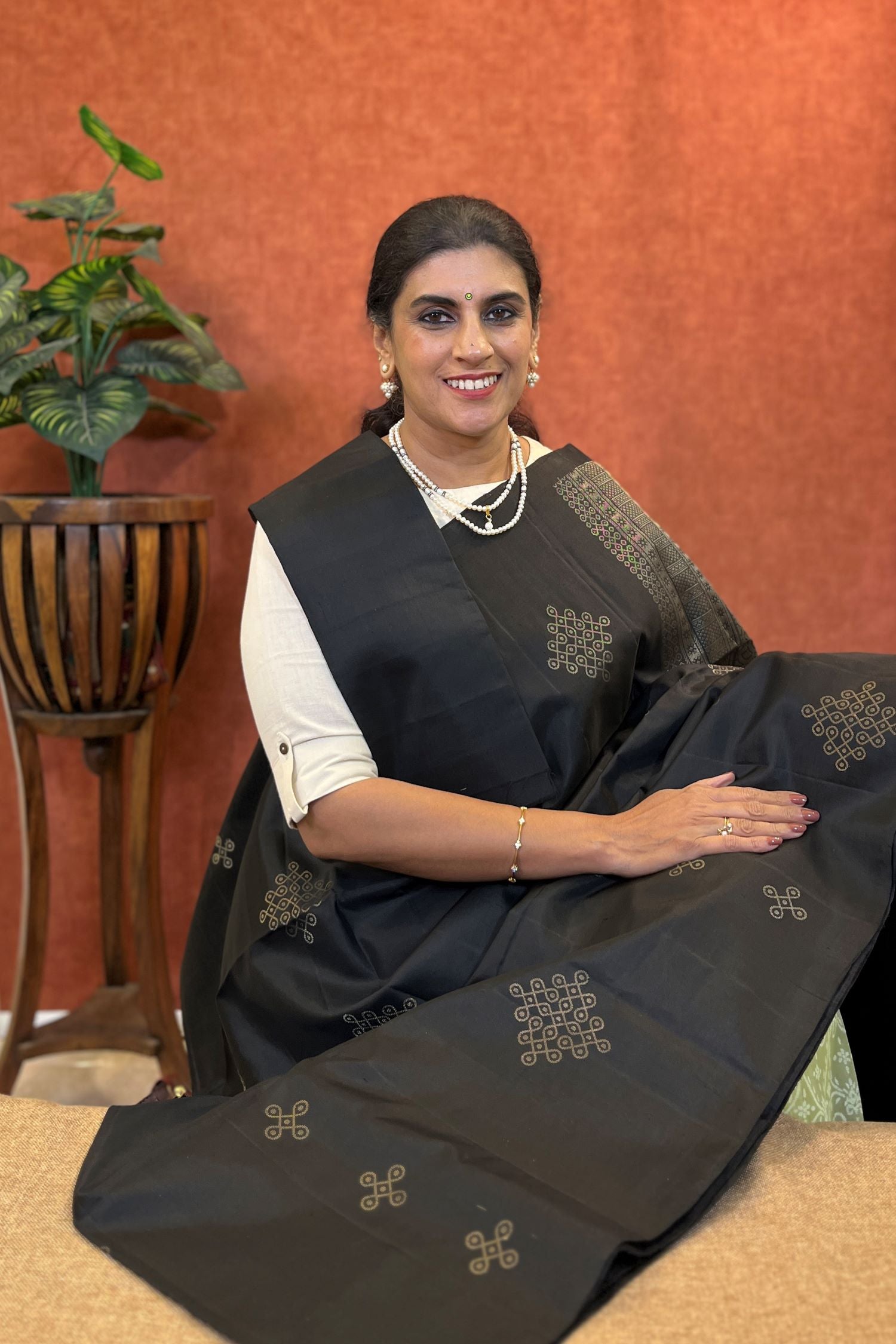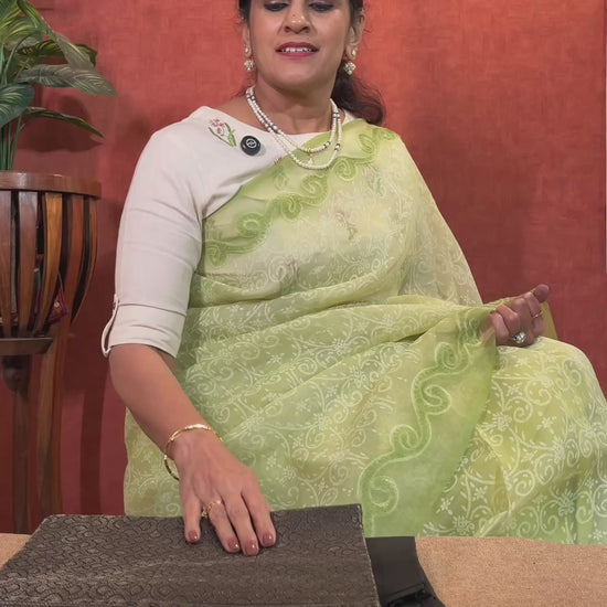 “An absolutely elegant soft silk saree in a timeless and trendy black, adorned with intricate rangoli designs across the body. The grand pallu enhances its sophistication, while the borderless design allows for endless styling possibilities—pair it with any blouse to showcase your creativity and personal flair.”